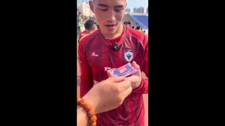 4月1日讯 4月1日,2026泰山好水CMG群众足球邀请赛小组最后一个比赛日,山东泰安队2-2战平青海玉树队,记者牛志明赛后向玉树队门将索南龙周赠送王大雷签名照。